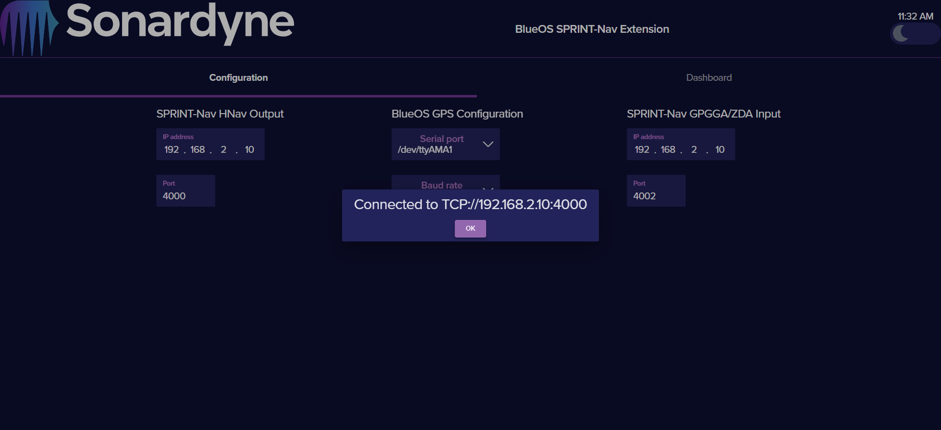 The user can now go back to the SPRINT-Nav extension and connect to the serial port by setting up the BlueOS GNSS Configuration option. Once the alert appears that indicates success, the user can setup the SPRINT-Nav GPGGA/ZDA Input option, to start streaming the GNSS derived messages into the SPRINT-Nav.