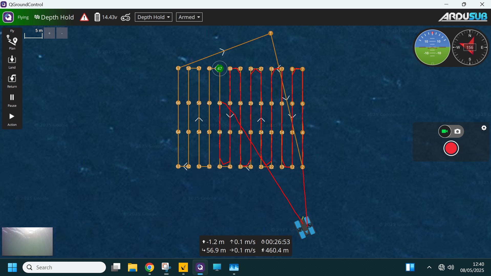 The image below shows the BlueROV following a survey line before being instructed to return to a point near the starting position.