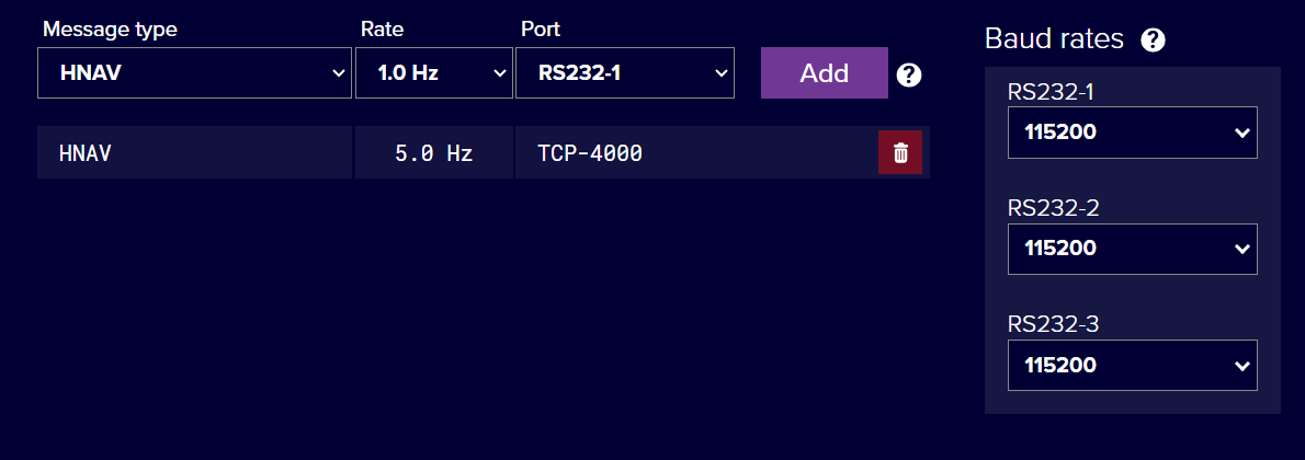 Under Configuration > Outputs, select HNav, it is recommended to only use a rate of up to 5 Hz , and set the output to be any TCP server port. This example uses port 4000.