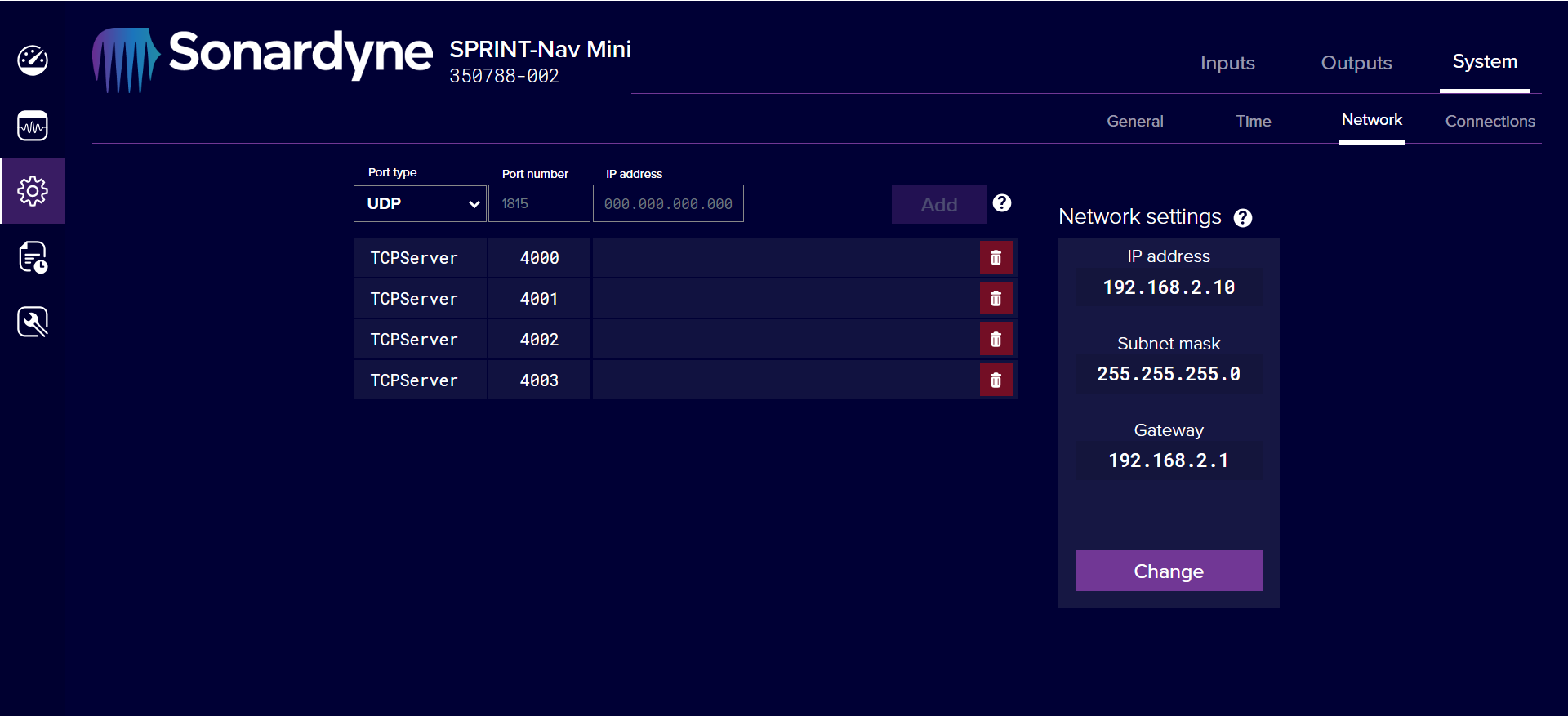 Under Configuration > System > Network ensure there are at least two TCP server ports available. Sonardyne recommends not using ports already in use for other messages.