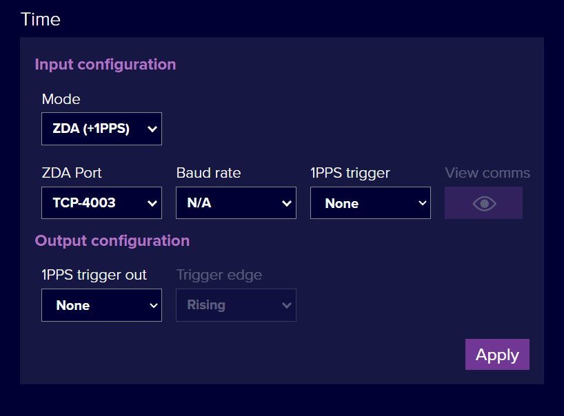 Navigate to Configuration > SYSTEM > TIME. For this example TCP Server port 4002 was used. This is the same port for GNSS input. Click Apply. Click View Comms, to monitor the incoming traffic into the SPRINT-Nav on this port.